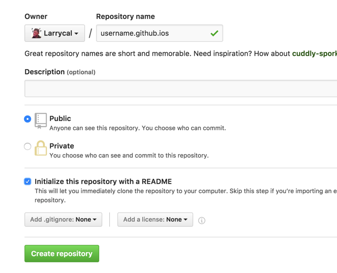 username.github.io,勾选Initialize this repository with a READEME会自动为我们建立一个reademe.md文件,我们可以在其中添加自己的github的说明。