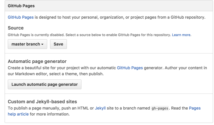 在设置界面中找到GitHub Pages,将source设置为master branch 点击保存。这样github page就会以我们上传在master分支中的页面为准。