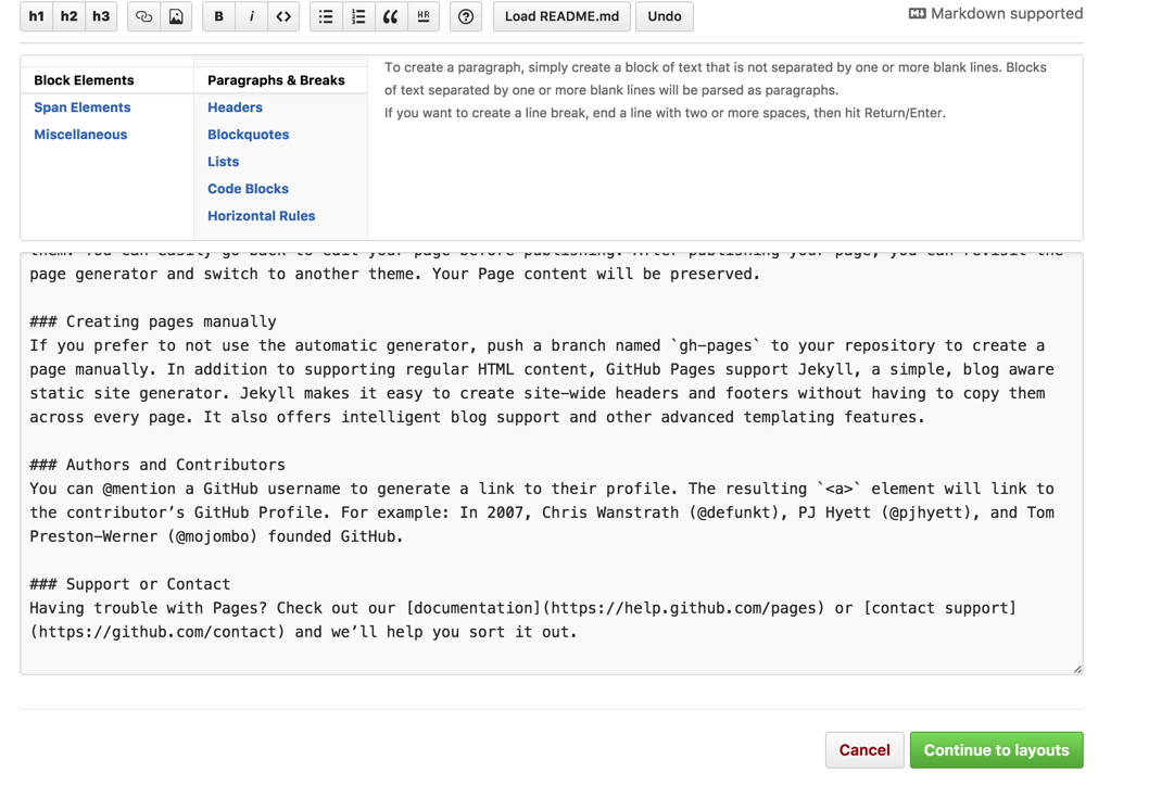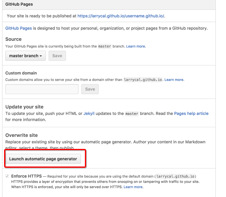 设置完成之后,点击页面如图所示。我们可以在Overwrite site中配置个人博客,点击Launch automatic page generator->continue to layouts->随便选择一款模板->Publish page