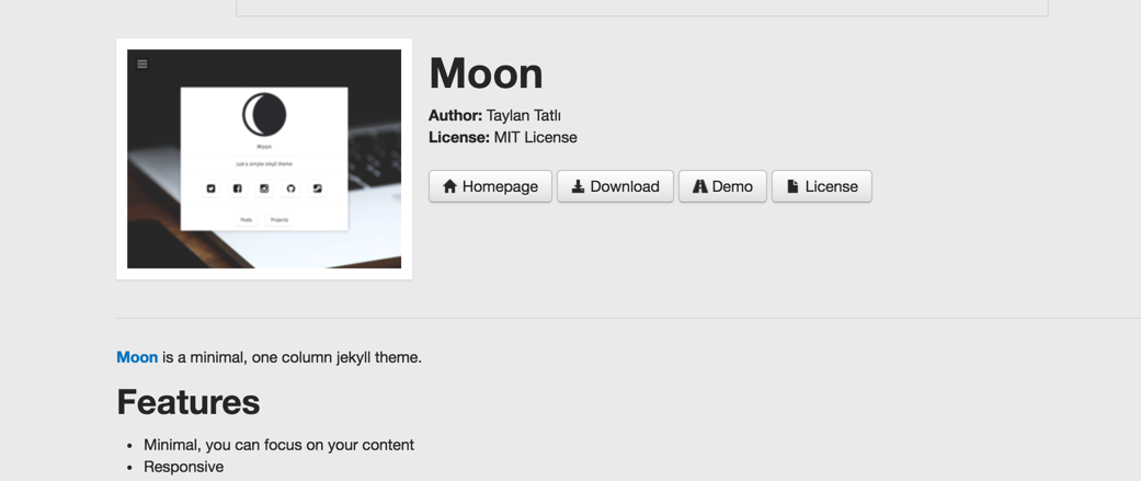配置完成github page 之后,我们需要对页面重新进行排版。我们可以在Jekyll模板站中找到自己喜欢的模板。例如我的是:Moon,点击进入后,会有一些模板的介绍。