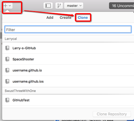 - 下载安装完成后,登录我们的github账号,点击+号->clone 选择我们刚刚建立的仓库username.github.io