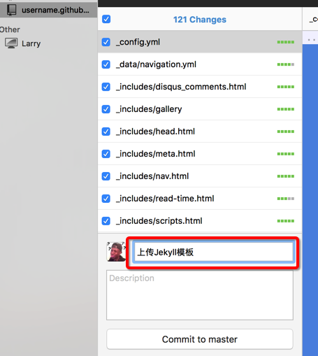 - 解压后,发现我们的本地仓库多了很多Changes,输入描述之后(红框部分)点击Commit to master