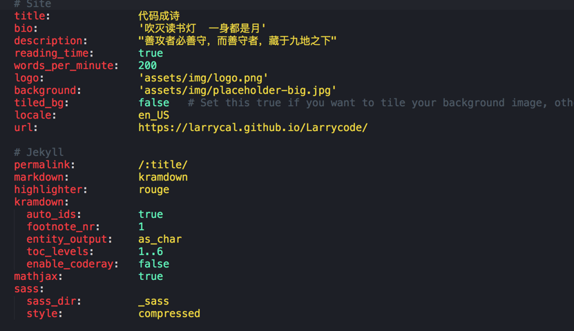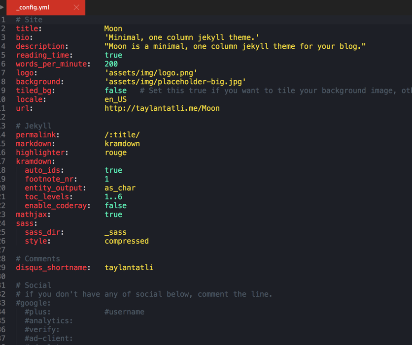我们下载好的模板,上述东西都具有,_site文件夹除外。在我们下载的模板中,一般都会有详细的模板说明,怎么将模板更改成我们自己的。这里我就用我的模板(Moon)来举例。 用文本编辑器或者sublime text打开_config.yml