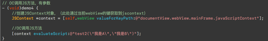 还有一种是JS里面通过对象调用方法,此处不作说明,详情请见:IOS js oc相互调用(JavaScriptCore)(二)